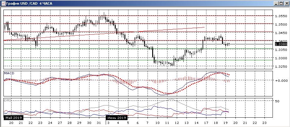 На четырёхчасовом графике консолидация выше 1,3400 завершилась не продолжением роста, а снижением пары ниже этого уровня. Потенциально это может завершить коррекцию с 10-11 июня. Однако сильный рост цен на нефть не привёл к значительному укреплению канадского доллара, и давление в сторону роста может продолжиться, так как развития движения вниз пока не происходит (пара удерживается выше поддержки на 1,3350). Завершение заседания FOMC США в среду оставляет закрепление выше или ниже уровня 1,3400 больше зависящим от новостей, а вместе с этим в дальнейшее движение в краткосрочной перспективе.
