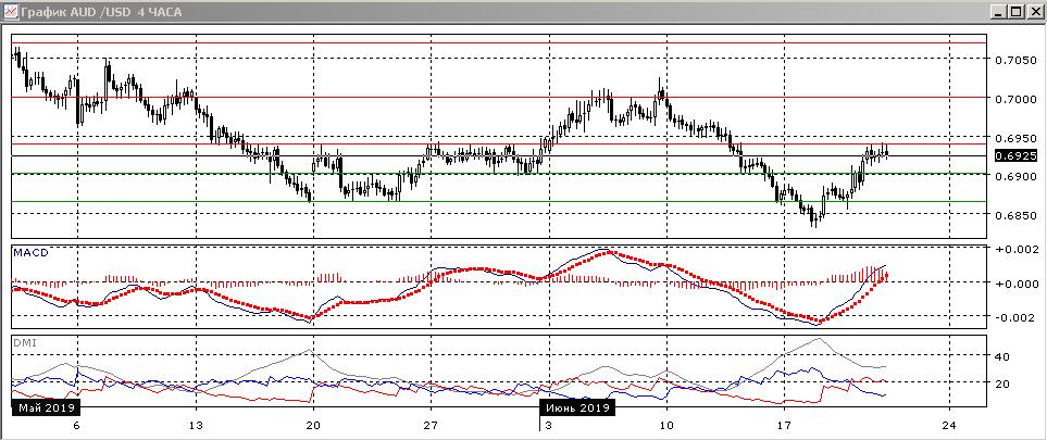 На четырёхчасовом графике остановка ниже 0,6940 видна лучше, образуются свечи «дожи». Размер волны роста сейчас равен примерно середине волны снижения с 7 июня. Относительные максимумы и минимумы пары сейчас растут. Так как пара перед сильным уровнем сопротивления в этом масштабе, то снижение в краткосрочной перспективе кажется предпочтительным, но на 0,6900 пара может получить поддержку. По индикаторам направленного движения пара перешла к росту: DM+ сейчас выше DM-, гистограмма MACD в положительной зоне, линия MACD имеет положительный наклон.