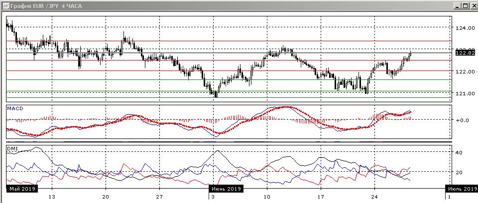 На четырёхчасовом графике пара преодолела максимум 25 июня, что открывает пространство для дальнейшего роста пары, хотя имеется медвежье расхождение максимумов пары и гистограммы MACD, что увеличивает вероятность снижения. Пока пара выше 122,50, скорее рост продолжится до максимума июня у 123,15.
