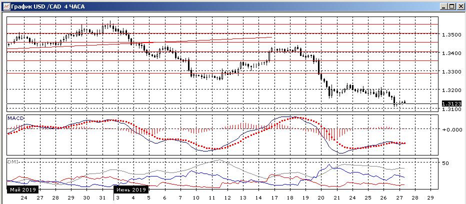 На дневном графике пара достигла минимумов конца февраля — начала марта. Это также близко к минимуму начала февраля у 1,3070. Поддержка может усилиться от сочетания к «круглым» уровнем 1,3100. Пара довольно резко снизилась, и теперь волна снижения уже достаточно большая, если рассматривать движение от максимума июня у 1,3570. Также текущую волну снижения с 18 июня может ограничивать то, что она примерно равна волне снижения с начала июня. По индикаторам направленного движения, однако, замедление снижения не видно, тенденция сильная и идти против неё рискованно.