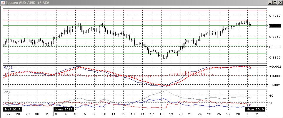 На четырёхчасовом графике, возможно, происходит разворот — от максимума июня у 0,7025 пара стала снижаться, там образовалось медвежье поглощение, и пара снизилась ниже круглого уровня 0,7000. По более краткосрочным индикаторам направленного движения пара перешла к снижению: гистограмма MACD снижается в отрицательной зоне, линия MACD развернулась. По ADX превышение DM+ над DM- почти отсутствует. Закрепление ниже 0,7000 может привести пару к следующей поддержке на 0,6950.