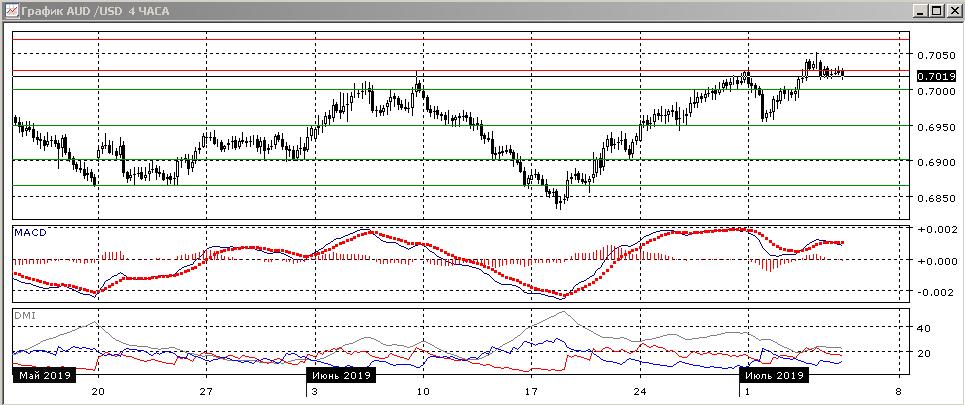 На четырёхчасовом графике новое преодоление «круглого» уровня 0,7000 является бычьим сигналом — разворот от 0,7025 не продолжился, и откат был полностью нейтрализован, пара достигла нового максимума. С другой стороны, пара консолидируется сейчас ниже сопротивления на 0,7025, и краткосрочный прорыв вверх может быть ложным пробоем, что также является медвежьим знаком. Пока пара ниже 0,7025, откат от этого уровня кажется более предпочтительным.