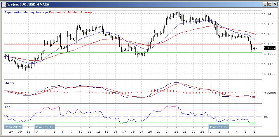 В течение Азиатской торговой сессии в понедельник данная валютная пара торгуется с небольшой консолидацией цены, оставаясь в пределах уровня поддержки на 1.1204 и уровня сопротивления на 1.1246. Следует отметить, что четырёхчасовой график продолжает развиваться ниже скользящих средних с периодом 21 и 55 дней, которые по-прежнему снижаются и продолжают расхождение, после формирования сигнала на продажу.