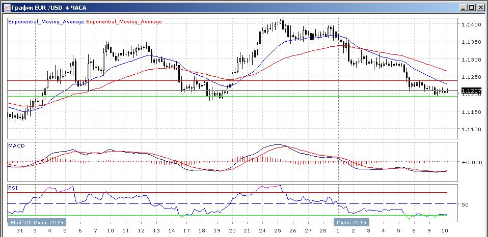 На четырёхчасовом графике скользящие средние с периодом 21 и 55 дней существенно замедлились и пока сохраняют сильное расхождение, но не меняют текущей тенденции.