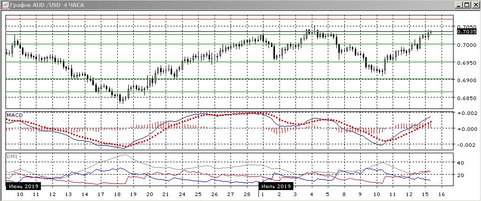 На четырёхчасовом графике пара уже выше сопротивления на 0,7025. Пока признаков ослабления волны роста после отскока вверх от 0,6900 не видно. Рост в пятницу несмотря на образование около 0,7000 медвежьей свечной комбинации с «падающей звездой» является скорее бычьим знаком, так как сигнал не сработал и пара преодолела психологически важный уровень.