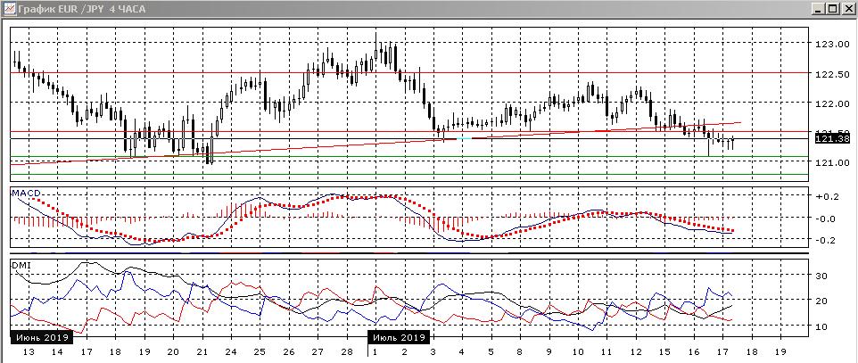 На дневном графике пара снизилась ниже линии тренда с начала июня, также было закрытие ниже предыдущего относительного минимума. Выход из треугольника, образованного с конца мая, вниз, предполагает продолжение тенденции снижения. Ближайшая цель видится на минимуме июня, у 120,80.