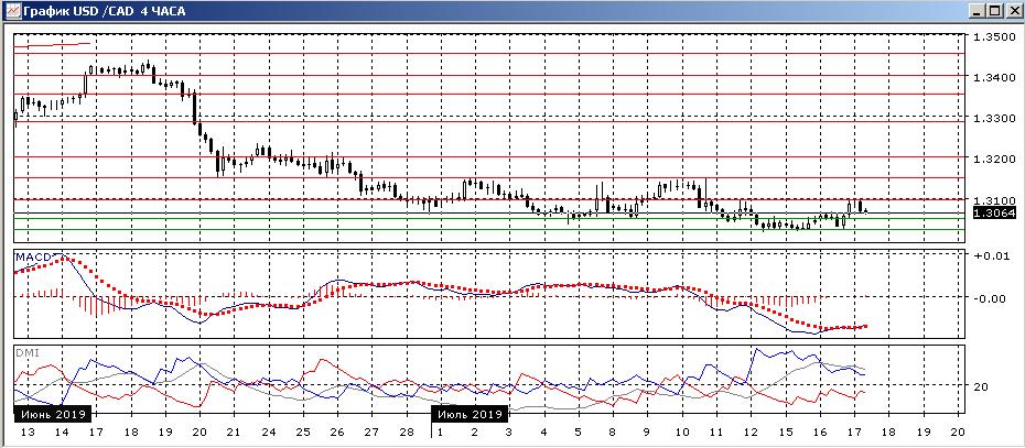 На четырёхчасовом графике пара неоднократно тестировала уровень 1,3025, и после этого выросла до 1,3100. До этого образовалось бычье расхождение минимумов пары и гистограммы MACD, и преодоление 1,3100 может стать подтверждением сигнала. Однако пока этого не произошло, возвращение к 1,3125 и новое тестирование этого уровня видится более вероятным. По индикаторам направленного движения — коррекция к снижению — DM- существенно выше DM+, гистограмма MACD стабилизировалась около нуля, линия MACD, кажется разворачивается