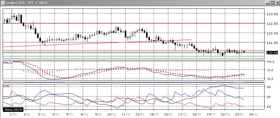 На четырёхчасовом графике пара остаётся в диапазоне 120,80-121,10. Более узкая консолидация происходит у верхней границы диапазона , колебания идут около 121,00. В рамках движения в диапазоне предпочтительно снижение к нижней границе, но консолидация у верхней границы увеличивает вероятность выхода из диапазона вверх, против предыдущей тенденции. Из-за этого ситуация скорее нейтральная. По индикаторам направленного движения коррекция к снижению: по ADX тенденция снижения остаётся сильной, ADX на высоком уровне, превышение DM- над DM+ значительное и устойчивое.