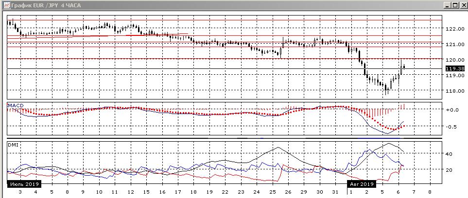 На четырёхчасовом графике уровень 120,00 примерно соответствует уровню коррекции 61,8% к снижению с конца июля, что укрепляет сопротивление на 120,00. Откат в начале вторника скорее подтверждает силу сопротивления на этом уровне. По индикаторам направленного движения тенденции снижения уже не видно: DM- и DM+ сблизились, гистограмма MACD растёт в положительной зоне, линия MACD развернулась вверх. Исходя из предположения о завершении коррекции, скорее пара вновь будет тестировать уровень 118,00.