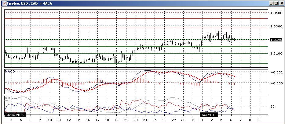 На четырёхчасовом графике ситуация примерно нейтральная. С одной стороны, образуется полукруглая вершина с начала августа. С другой стороны, пара не преодолела «круглый» уровень 1,3200, и пока она остаётся выше максимумов конца июля, что соответствует картине последовательного роста. По индикаторам направленного движения скорее флэт: DM+ и DM- близки, гистограмма MACD снижается, но остаётся в пределах колебаний около нулевого уровня с конца июля.