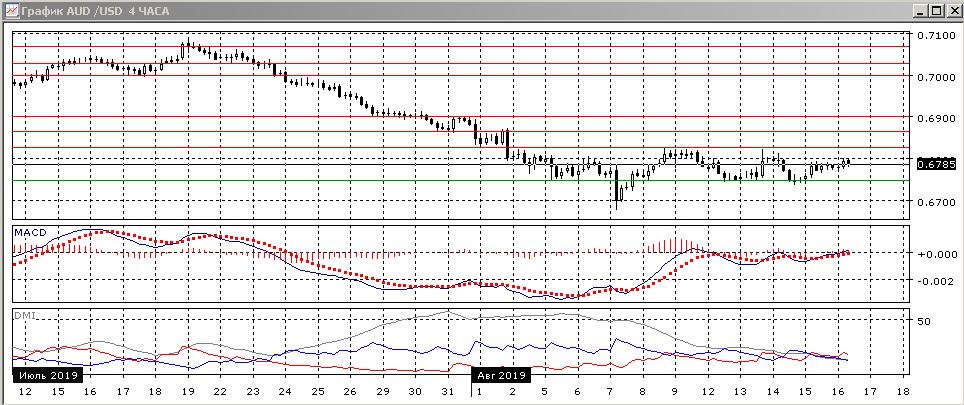 На четырёхчасовом графике диапазон 0,6750-0,6825 виден лучше. В рамках движения в диапазоне предпочтительно движение к верхней границе, так как нижней пара уже достигала. По индикаторам направленного движения остаётся флэт: DM- и DM+ близки, гистограмма MACD колеблется около нуля.