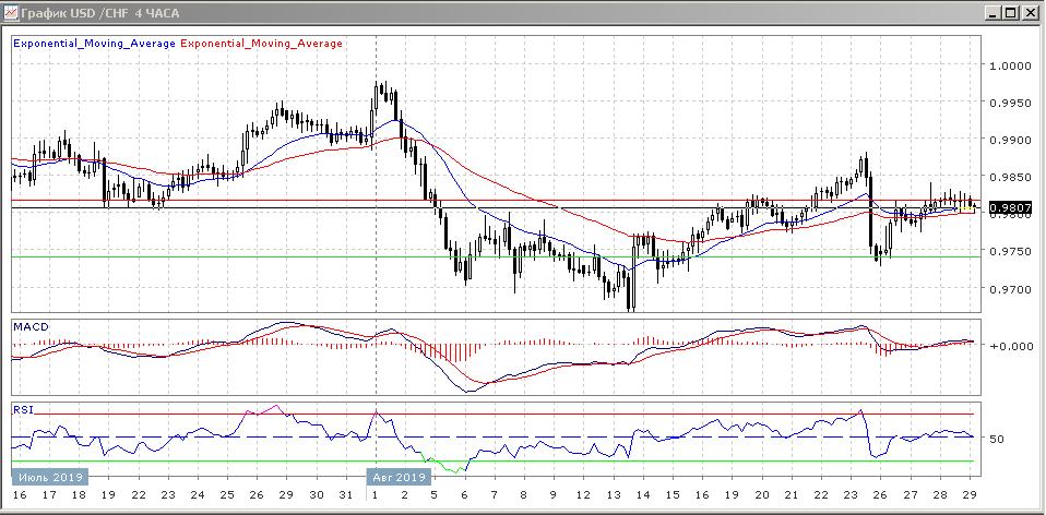 На четырёхчасовом графике скользящие средние с периодом 21 и 55 дней замедлились и продолжают демонстрировать консолидация консолидацию цены этого торгового инструмента. График рынка остаётся между скользящих средних, что свидетельствует о слабости обеих противоборствующих сторон и набирающей силу консолидации.