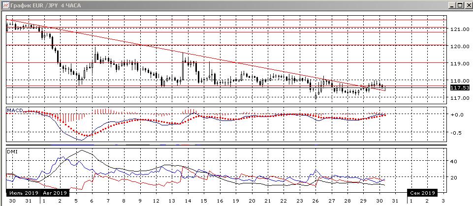 На четырёхчасовом графике пара снова снижается от уровня 118,00. По индикаторам направленного движения флэт: DM+ и DM- пересекаются при низком уровне ADX, гистограмма MACD колеблется около нуля. Пара остаётся выше линии нисходящего тренда с конца июля, и он может выступить сейчас поддержкой. Для возобновления снижение необходимо, чтобы пара снова закрепилась ниже 177,65.