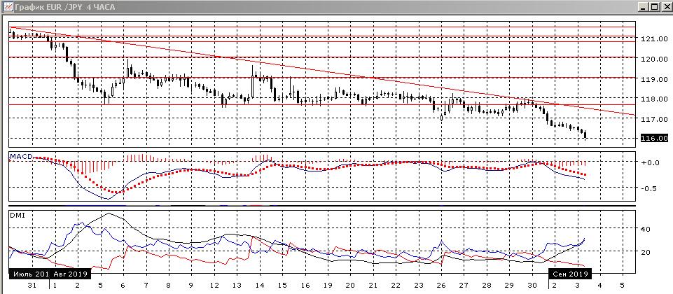 На четырёхчасовом графике продолжается снижение пары от сопротивления на 118,00. Тенденция усиливается — увеличился наклон графика, по ADX пара вышла из флэта и снижение стало сильной тенденцией: превышение DM- над DM+ большое, уровень ADX вырос. Пока, скорее, снижение будет продолжаться — рынок нашёл направления наименьшего сопротивления.