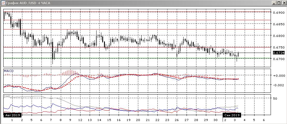 На дневном графике пара продолжила снижение после выхода из диапазона 0,6750-0,6800 вниз, и она достигла следующего «круглого» уровня 0,6700, который также является целью измеренного движения. Однако около этого уровня два минимума августа. На фундаментальных новостях пара не преодолела поддержки на 0,6700 (но тут стоит дождаться закрытия). Скорее, это создаёт отскок возможным. По ADX тенденция снижения остаётся сильной — превышение DM- над DM+ большое и устойчивое, ADX на высоком уровне и растёт.