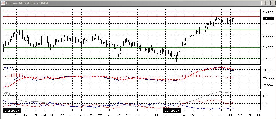 На четырёхчасовом графике образовалось медвежье расхождение максимумов пары и гистограммы MACD, что увеличивает вероятность отката, первоначально к 0,6850 (поддержка 10-11 сентября). Преодоление этого уровня стало бы подтверждением сигнала. Однако фактически разворота пока нет, по ADX тенденция роста сильная: превышение DM+ над DM- большое и устойчивое, ADX на высоком уровне. Скорее, рост возобновится после отката.