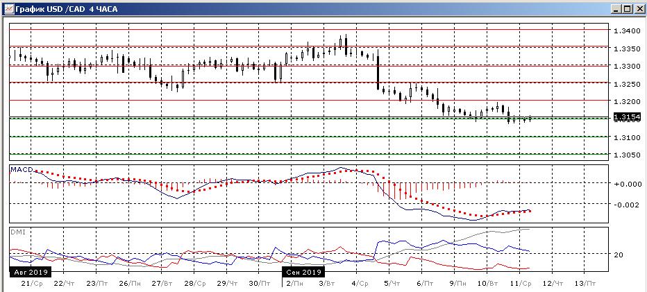 На четырёхчасовом графике движение приостановилось у 1,3150. Около этого уровня образовалось новое бычье расхождение минимумов пары и гистограммы MACD, при закреплении выше 1,3150 это может привести к восстановлению до 1,3200 (сопротивлению на «круглом» уровне, около которого был минимум 5 сентября и максимум 10 сентября). Однако пока пара тестирует уровень 1,3150 снизу и остаётся ниже него, что при стабилизации может привести к дальнейшему снижению — дальнейшая краткосрочная перспектива, скорее, зависит от того, останется ли пара ниже 1,3150 или восстановится выше него.
