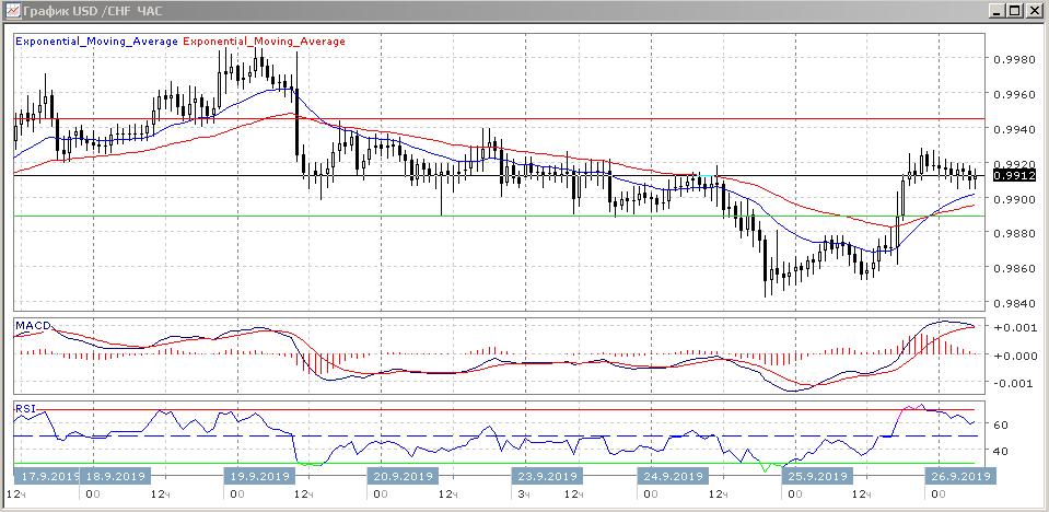 С открытием азиатской торговой сессии в четверг данная валютная пара сохраняется в узком диапазоне, где цена продолжает консолидироваться в рамках уровня поддержки на 0.9889 и уровня сопротивления на 0.9944. Следует заметить, что скользящие средние с периодом 21 и 55 дней чуть ускорились и развернулись вверх. Однако часовой график сохраняется выше скользящих средних.