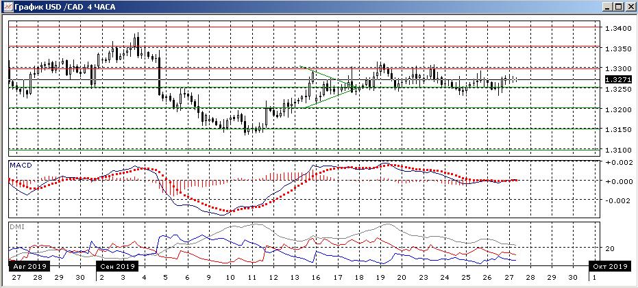 На четырёхчасовом графике пара также остаётся в диапазоне 1,3250-1,3300, два выхода вниз были очень кратковременными. Если рассматривать их как «ложные пробои», предпочтительно движение к верхней границе диапазона на 1,3300. Сейчас образуются свечи «дожи» примерно в середине диапазона, это тоже может быть сигналом нейтральной ситуации.