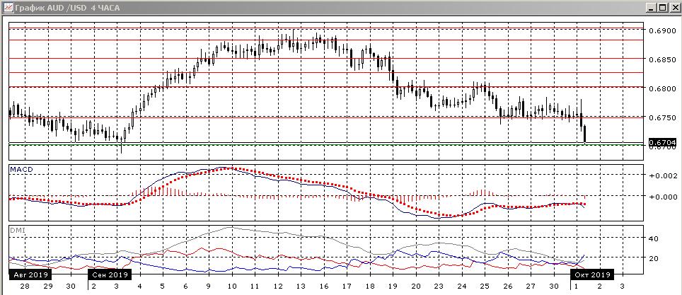 На дневном графике пара после приостановки движения у 0,6750, кажется, преодолевает этот уровень, и вероятно она будет тестировать ближайший «круглый» уровень 0,6700, который уже близко. Пара почти полностью нейтрализовала рост с начала сентября, и скорее снижение достигнет исходной точки роста ниже 0,6700. Закрытие ниже 0,6750 облегчит движение вниз, так как тогда будет преодолён значимый уровень поддержки, действовавшей в августе и сентября. По индикаторам направленного движения тенденцией остаётся снижение: DM- выше DM+ превышение увеличивается, гистограмма MACD снижается в отрицательной зоне, линия MACD сохраняет отрицательный наклон.