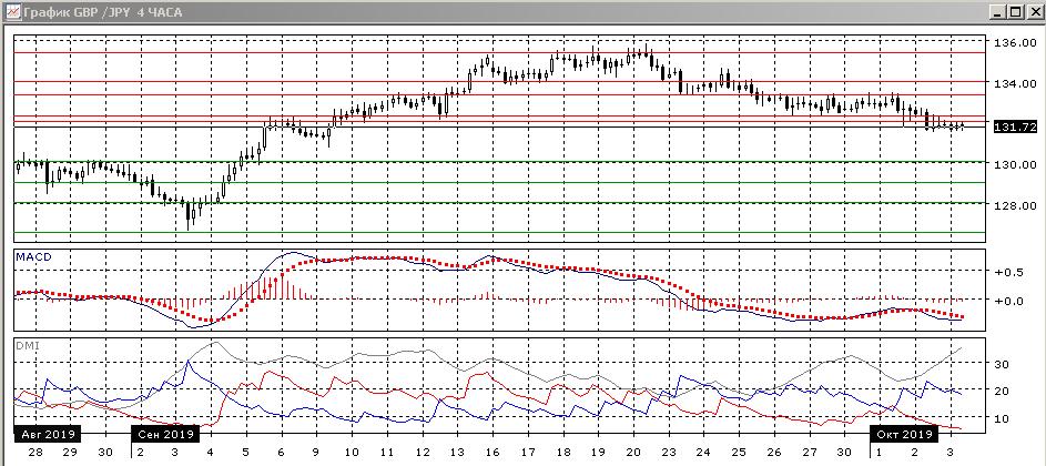 На дневном графике снижение пары продолжилось и она преодолела поддержку 132,30 (этот уровень проявлялся в начале и в конце сентября). Теперь вблизи обоснованной поддержки не видно, и это облегчает продолжение снижения. Следующая сильная поддержка на 130,00 — сопротивление в августе. По индикаторам направленного движения тенденцией является снижение: DM- выше DM+ (хотя ADX на относительно низком уровне), гистограмма MACD снижается в отрицательной зоне, линия MACD имеет отрицательный наклон.