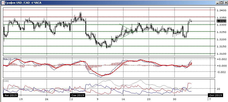 На четырёхчасовом графике картина образования полукруглой вершины у 1,3300 нарушена. Последовательность снижения относительных максимумов и минимумов пары тоже нарушена (относительные максимумы сейчас растут). При откате после сильного роста в среду поддержкой может выступить уровень 1,3300, так как это сильный уровень сопротивления ранее. По индикаторам направленного движения тенденцией стал рост: DM+ значительно выше DM-, уровень ADX вырос, гистограмма MACD растёт в положительной зоне, линия MACD имеет положительный наклон. Пока пара выше 1,3300, тестирование 1,3350 кажется предпочтительным.
