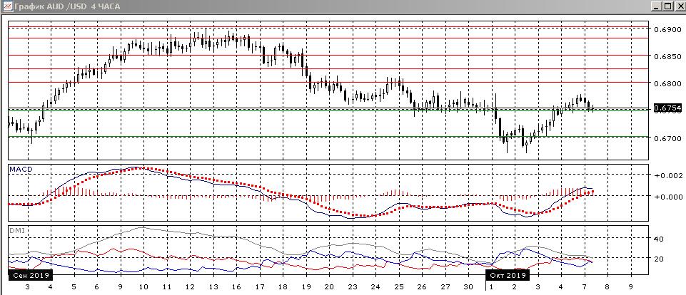 На четырёхчасовом графике пара выросла после образования двойного дна у 0,6670, также там образовалась разворотная свечная комбинация с «молотом». После этого последовательность снижения относительных максимумов и минимумов пары была нарушена. Откат 4 октября был от уровней максимумов 26 сентября — 1 октября. Сейчас при откате поддержкой выступает уровень 0,6750 (как в конце сентября и 4 октября). Как и в более крупном масштабе, дальнейшая перспектива, вероятно, зависит от устойчивости уровня 0,6750: при закреплении ниже это обозначает завершение коррекции вверх к снижению от 0,6900. Если пара удержится выше, это делает более вероятным движение к следующему сильному сопротивлению на 0,6800.