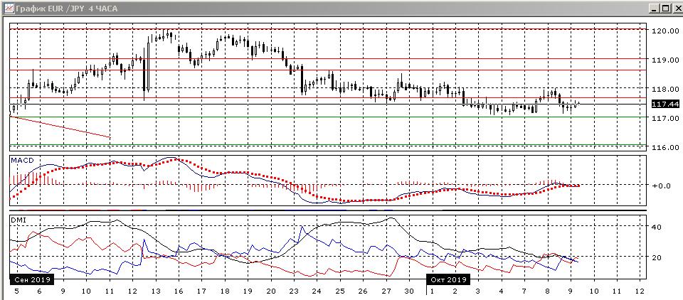 На четырёхчасовом графике скорее наблюдается стабилизация. Последовательное снижение прекратилось, максимумы 7-8 октября были выше предыдущих 3-4. При пробое уровня 117,65 пара встретила сопротивление на ближайшем следующем обоснованном уровне сопротивления 118,00 (он проявлялся в сентябре и начале октября). Приближение к 117,00 активизирует поддержку для пары. Если рассматривать канал 117-118, то более вероятный выход из него вниз — так кк это направление предыдущего движения и так как пробой вверх оказался ложным. По индикаторам направленного движения сейчас флэт: DM- и DM+ близки, уровень ADX снизился, гистограмма MACD около нуля, линия MACD близка к горизонтали.