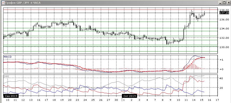 На четырёхчасовом графике пара после отката от 138,00 приближается обратно к этому уровню. Поддержка при откате была на уровне сопротивления 13-20 сентября. Тенденция роста в этом масштабе сильная. По ADX тенденция роста очень сильная: превышение DM+ над DM- очень большое, при очень высоком уровне ADX. Сопротивление на 138,00 может усилиться из-за образования на этом уровне, если рост будет в ближайшей перспективе, медвежьего расхождения максимумов пары и гистограммы MACD.