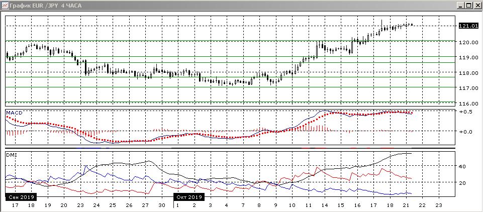 На дневном графике рост продолжился, пара достигла цели измеренного движения, равного волне роста с начала сентября на 121,00. Образование верхней тени в пятницу может после значительного роста без откатов (от 117,00) может сигнализировать об откате. Однако пока пара выше 120,00, скорее рост будет продолжаться. Следующее сильное сопротивление на 122,00, это примерно соответствует центру треугольника начала июня — середины июля. По индикаторам направленного движения тенденцией остаётся рост: DM+ значительно выше DM-, уровень ADX продолжает расти, гистограмма MACD растёт в положительной зоне, линия MACD имеет положительный наклон.