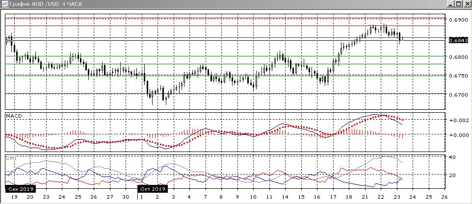 На четырёхчасовом графике пара снизилась после тестирования уровня 0,6880, там образовалась небольшая двойная вершина. По индикаторам направленного движения происходит коррекция к росту: превышение DM+ над DM- стало небольшим, гистограмма MACD снижается в отрицательной области, линия MACD получила отрицательный наклон. В среду пара преодолела поддержку вторника на 0,6850, и сейчас она выступает уже сопротивлением для пары. Исходя из предположения, что происходит именно коррекция, а не разворот, скорее надо искать момент возобновления роста.