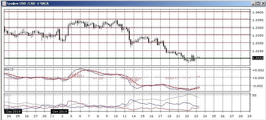 Снижение пары продолжилось, во вторник она достигла нового минимума, но на уровне 1,3100 снижение может приостановиться, так как образовалась свеча «дои» после относительно большой волны снижения. В более широкой перспективе то, что пара остаётся ниже уровня поддержки 1,3150 около минимума сентября, и большая часть роста с начала июля уже отыграна, делает продолжение снижения до минимумов июля предпочтительным. Также ещё не достигнута цель измеренного движения, равного ширине диапазона 1,32-1,3350 после выхода из него вниз. По индикаторам направленного движения тенденция снижения сильная: превышение DM- над DM+ большое, ADX на относительно высоком уровне, гистограмма MACD снижается в отрицательной зоне, линия MACD имеет отрицательный наклон.