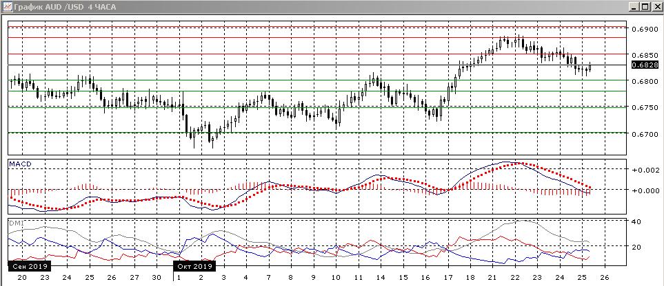 На четырёхчасовом графике пара последовательно снижается — относительные максимумы и минимумы снижаются от 0,6880. Уровень 0,6800 является уровнем 50% коррекции к росту 16-21 октября, что укрепляет поддержку на 0,6800 как на «круглом» уровне, поэтому пока снижение остаётся в пределах коррекционного к росту. По индикаторам направленного движения тенденцией стало снижение: DM- выше DM+, гистограмма MACD находится в отрицательной зоне, линия MACD имеет отрицательный наклон.