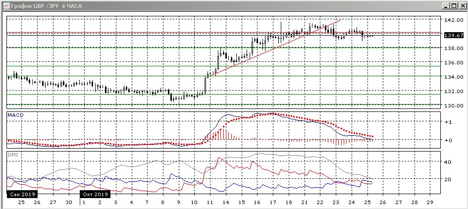 На четырёхчасовом графике пара продолжает оставаться около 140,00. В сторону снижения закрепление пары ниже 140,00, и снижение относительных минимумов с 17 октября. Потенциально это может образовать полукруглую вершину с центром 21 октября. По индикаторам направленного движения снижение является слабой тенденцией: DM- немного выше DM+, гистограмма MACD остаётся в отрицательной зоне, линия MACD сохраняет отрицательный наклон.