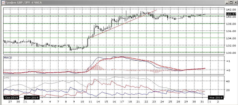 На четырёхчасовом графике в целом ситуация не изменилась, пара остаётся около 140,00. Относительны максимумы и минимумы пары растут с 25 октября, рост очень медленный, скорее это больше похоже на очень узкую консолидацию около 140,00. Краткосрочно пара остаётся в диапазоне около 139,00-140,40. Если не будет закрепления выше, при движении в диапазоне более вероятно снижение к нижней границе на 139,00. Если пара преодолеет максимумы 24 и 29-30 октября, то это открыло бы дорогу к движению к 141,50 (у максимумов октября).