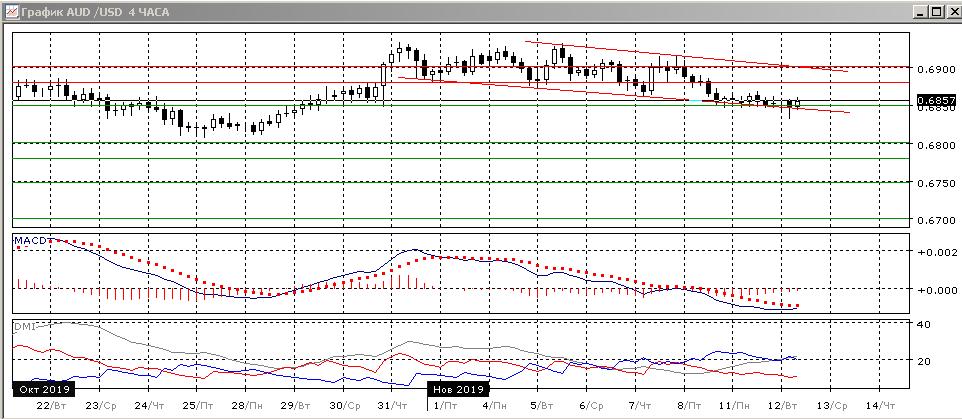 На четырёхчасовом графике пара находится у нижней границы нисходящего канала. И в узком диапазоне выше уровня поддержки 0,6850. Дальнейшая перспектива в этом масштабе скорее будет зависеть от устойчивости уровня 0,6850. Если пара остаётся в канале, более вероятно движение к верхней границе ниже 0,6900. Если пара выходит из канала вниз (преодолевается уровень 0,6850), то открывается пространство для движения к следующему уровню поддержки на 0,6800. По индикаторам направленного движения снижение замедляется: тенденция снижения сильная, DM- значительно выше DM+, ADX на относительно высоком уровне, замедление видно по росту гистограммы MACD.