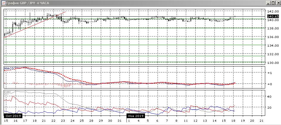 На четырёхчасовом графике нет изменений: пара остаётся в узком диапазоне с 23 октября, продолжаются небольшие по размеру колебания около 140,00, границы узкого диапазона 139,60-140,75. Сейчас пара находится у верхней границы диапазона, и в рамках движения в диапазоне более вероятно снижение к нижней границе. По индикаторам направленного движения флэт: DM+ и DM- пересекаются, ADX на низком уровне, гистограмма MACD около нуля, линия MACD почти горизонтальна.