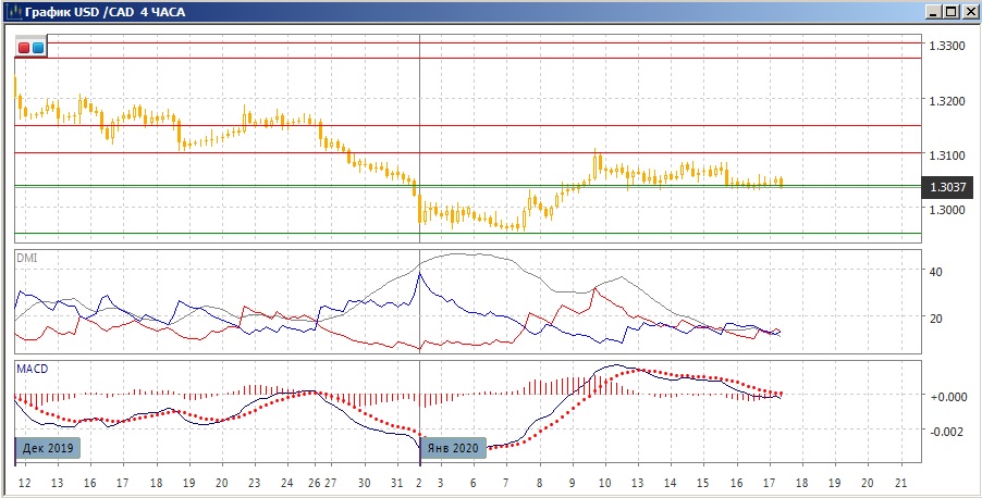 На четырёхчасовом графике продолжается тестирование уровня 1,3040 сверху. Преодоление этого уровня открыло бы пространство для снижения к 1,2950. По индикаторам в этом масштабе флэт. Увеличивает вероятность выхода вниз из диапазона 1,3040-1,3100 то, что с 15 января пара консолидируется совсем близко от нижней границы диапазона.