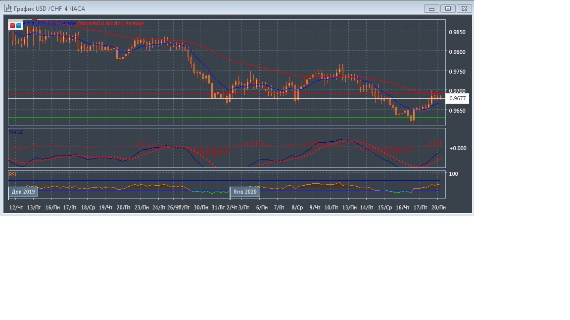 На четырёхчасовом графике скользящие средние с периодом 21 и 55 дней перестали снижаться, замедлились и близки к развороту вверх с сокращением расхождения. При этом график рынка вышел в область посреди экспоненциальных скользящих средних, что говорит о равноценном потенциале рынка в краткосрочной перспективе.