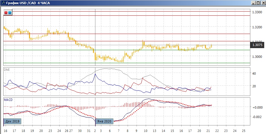 На дневном графике пара остаётся у уровня поддержки 1,3040. Пребывание в узкой консолидации выше 1,3040 после отскока вверх в начале января затягивается, по времени консолидация продолжается уже значительно больше, чем трёхдневный рост в начале января.. Чем дольше снижение не возобновляется, тем больше вероятность, что отскок вверх от 1,2950 в начале января был не коррекцией, а разворотом. Действовать скорее лучше в сторону выхода пары за пределы 1,3040-1,3100.