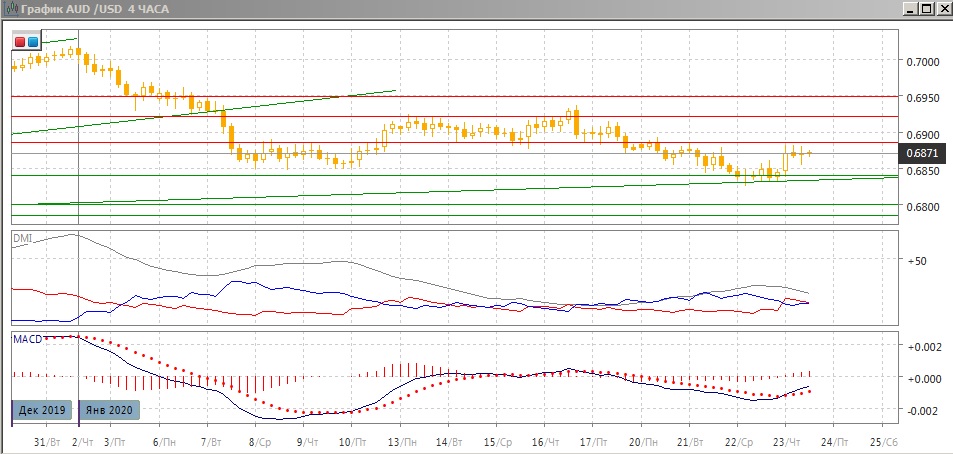 На дневном графике пара получила поддержку при приближении к долгосрочному тренду ещё до выхода данных по занятости, ставших спусковым крючком роста в четверг. Отскок произошёл от уровня поддержки на 0,6840 и линии долгосрочного восходящего тренда, если строить его с начала октября. Так же отсутствие прорыва этой зоны не подтвердило модель "голова-плечи". Однако текущий отскок вверх на данный момент не меняет картины снижения с начала января - относительные максимумы и минимумы снижаются, последний минимум, достигнутый в среду, был ниже предыдущего. По индикаторам направленного движения тенденцией остаётся снижение: DM- выше DM+, гистограмма MACD в отрицательной зоне, линия MACD имеет отрицательный наклон. Пока пара ниже 0,6920 (ближайшее сильное сопротивление), продолжение снижения кажется предпочтительным.