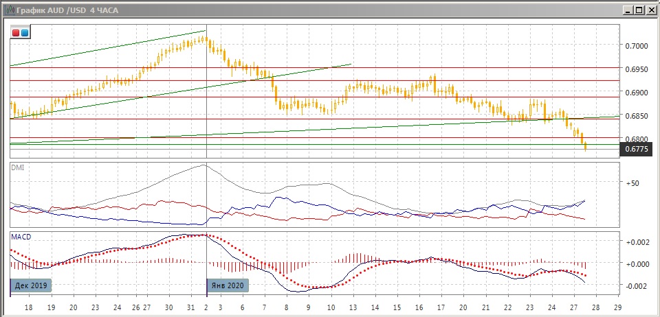 На дневном графике пара преодолела линию восходящего тренда с начала октября и линию шеи модели голова-плечи 0,6840. Исходя из размера модели в 180 пунктов целью снижения может быть 0,6660. Это примерно соответствует минимумам начала октября, однако до этого будет сильная поддержка на "круглом" уровне 0,6700, который проявлялся в августе-октябре. По индикаторам направленного движения тенденцией является снижение: DM- выше DM+, гистограмма MACD в отрицательной зоне, линия MACD имеет отрицательный наклон.
