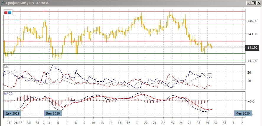 На четырёхчасовом графике уровень поддержки 142,40 выступил уже сопротивлением, от которого пара снижается, и ближайшей целью видится уровень начала коррекции 141,50. Ниже 142,40 образовалась "падающая звезда", за которой последовало снижение, это является подтверждением тенденции снижения на данный момент. По индикаторам направленного движения коррекция к снижению: DM- значительно выше DM+, но гистограмма MACD выросла к нулевому уровню, линия MACD перешла к горизонтали..