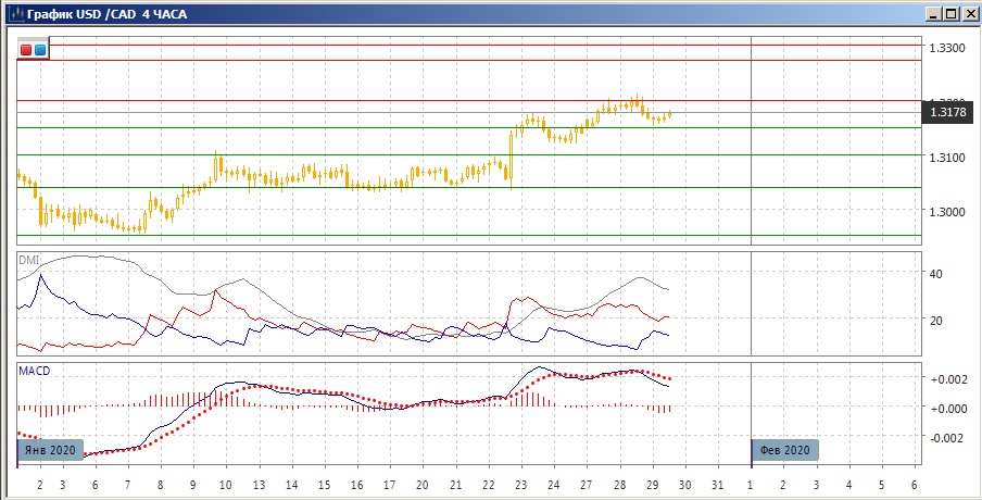 На четырёхчасовом графике откат от 1,3200 последовал за образованием медвежьего расхождения максимумов пары и гистограммы MACD, однако тенденцию это не изменило, вопоследовательность роста относительных максимумов и минимумов пары сохраняется, и пара вновь приближается к 1,3200, этот уровень видится сейчас ближайшей целью. По индикаторам направленного движения - коррекция к росту По ADX рост остаётся хорошо выраженной тенденцией: превышение DM+ над DM- значительное и устойчивое, ADX на высоком уровне. Коррекция видна по нахождению гистограммы MACD в отрицательной зоне и отрицательному наклону линии MACD.