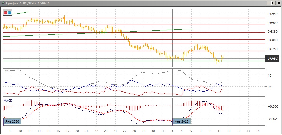 На четырёхчасовом графике происходит отскок вверх от уровня поддержки 0,6677, но уровнем 0,6700 он, кажется, ограничивается. Пара не преодолевает этого "круглого" уровня, образуются верхние тени свечей. Это не характерно для разворота. Поэтому, скорее, тестирование уровня 0,6677 продолжится. Рассчитывать на снижение ниже него стоит только после фактического преодоления, так как уровень поддержки сильный и вероятность отскока от него велика. В этом масштабе по индикаторам направленного движения тенденцией также является снижение: DM- выше DM+, ADX остаётся на относительно высоком уровне, гистограмма MACD в отрицательной зоне, линия MACD имеет отрицательный наклон.