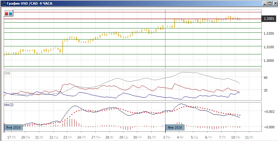 На четырёхчасовом графике рост постепенно замедляется. Это видно и по наклону графика, и по постепенному сокращению превышения DM+ над DM-. Пара остаётся в консолидации выше 1,3270, но закрепления выше 1,3300 в пятницу не произошло, и пара вновь снизилась ниже этого уровня. Это может быть ложным прорывом в увеличивает вероятность разворота вниз, если пара останется ниже 1,3300. Скорее, дальнейшее движение ближайшей перспективе будет определятся тем, куда выйдет пара из диапазона 1,3270-1,3300, сохраняющегося с 4 февраля.