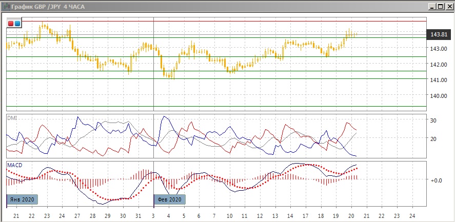 На дневном графике пара остаётся в диапазоне с начала декабря 141-144. Произошёл отскок от уровня поддержки 142,40, но пара остаётся в диапазоне, и в рамках движения в диапазоне более предпочтительным является остаётся снижение, так как пара находится у верхней границы. По индикаторам направленного движения в этом масштабе флэт: DM- и DM+ близки при низком уровне ADX, однако по более краткосрочным индикаторам виден рост: гистограмма MACD немного выросла в положительной зоне, линия MACD получила положительный наклон. Относительные максимумы и минимумы растут со 141, и для расчёта на снижение лучше дождаться возвращения ниже уровня 143,60.