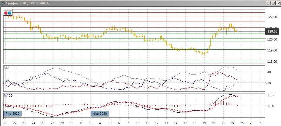 На дневном графике пара преодолела предыдущий минимум января, и в пятницу закрытие было выше него. Пара закрепилась выше важной зоны поддержки 119,80-120,00. Возврат пары в диапазон с декабря может привести к дальнейшему росту до 122,30. По индикаторам направленного движения тенденцией стал рост: DM+ выше DM-, гистограмма MACD в положительной зоне, линия MACD имеет положительный наклон. Также пара закрепилась выше 200-дневной средней, находящейся на 120,06. Это укрепляет поддержку на зоне 119,80--120. Пока пара выше этого уровня, рост в краткосрочной перспективе видится предпочтительным.