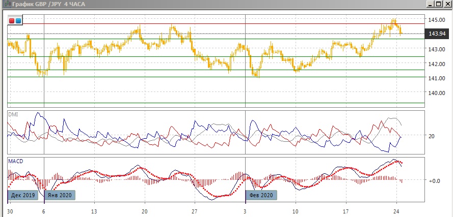 На четырёхчасовом графике картина ложного пробоя уровня 144,65 уже видна. Пробой вверх был краткосрочны, и при вернувшись ниже уровня 144,65 пара продолжила снижаться. Последовательность роста относительных максимумов и минимумов пока не нарушена, но по индикаторам направленного движения пара уже близка к развороту: DM+ и DM- сблизились, гистограмма MACD снижается уже в отрицательной зоне, линия MACD развернулась вниз. Ближайшая цель сейчас видится на уровне поддержки 143,60, при его преодолении - 142,40 (это более сильная поддержка).