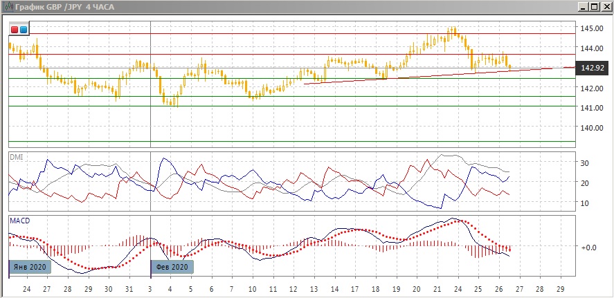 На четырёхчасовом графике картина пара остаётся ниже сопротивления на 143,60. На этом уровне могут быть плечи 13-17 и 25-26 февраля модели "голова-плечи". Линией шеи для модели была бы восходящая линия тренда по минимумам с 13 февраля. Преодоление этой линии подтвердило бы образование модели. Пока этого, однако, не произошло. Но в случае снижения размер этого снижения примерно ставил бы целью уровень 141, что соответствует предыдущему минимуму февраля. Если смотреть с другой стороны, консолидацию ниже 143,60 можно рассматривать как коррекцию к волне снижения 21-24 февраля, и пара вернулась почти к исходной точке коррекции. Это также делает продолжение снижения более вероятным. Ближайшая сильная поддержка - на 142,40.